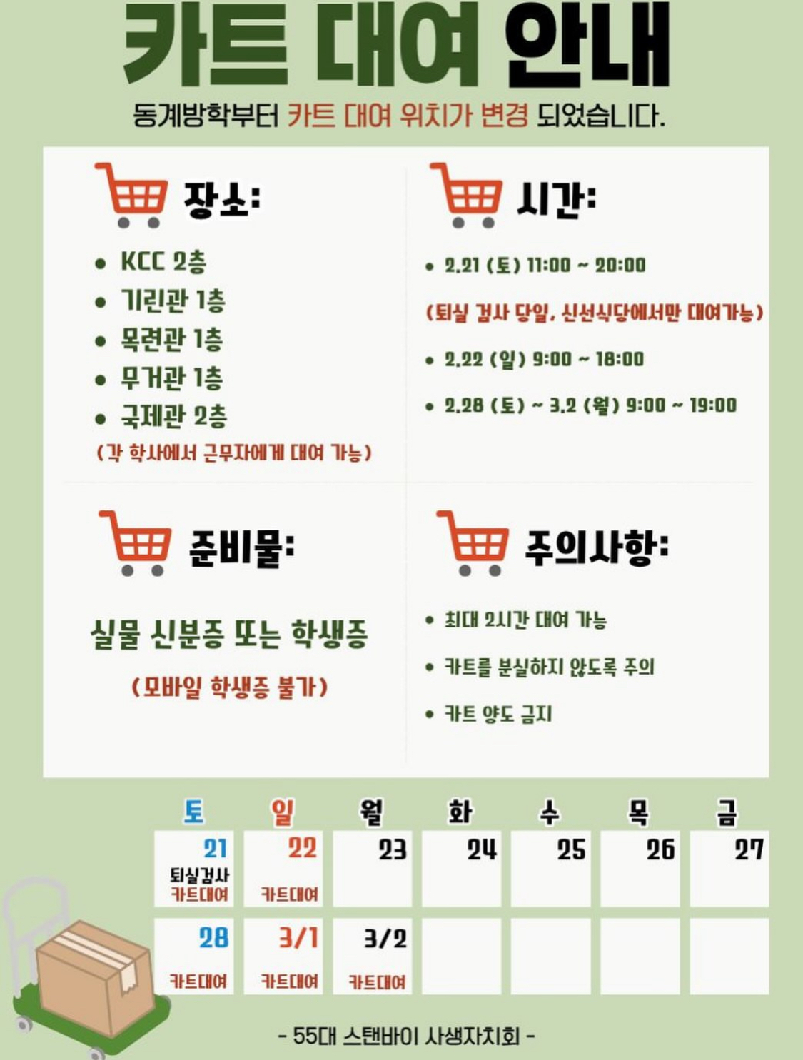 | 55대 스탠바이 사생자치회 “카트 대여 안내“ | |||||