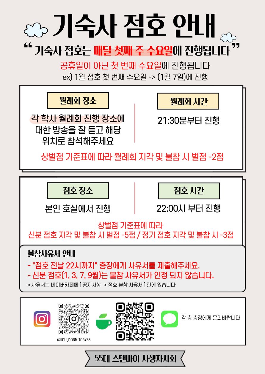 | 55대 스탠바이 사생자치회 “기숙사 점호 안내“ | |||||